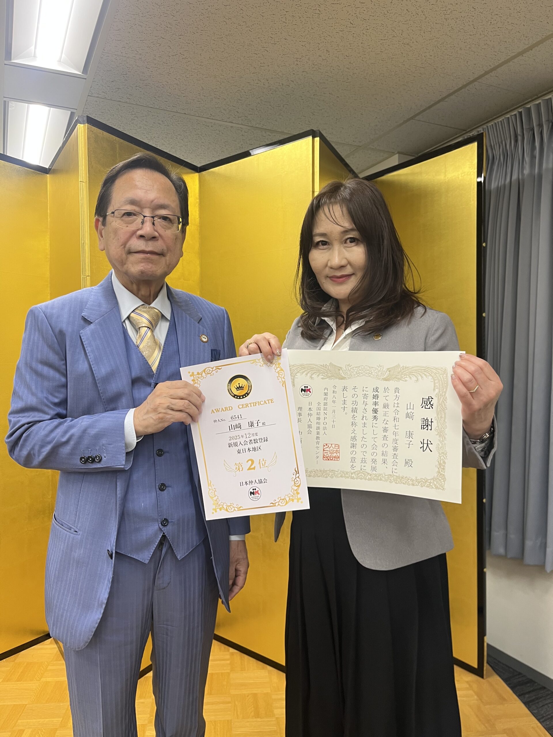 日本仲人協会さんより成婚感謝状&東日本登録者数第2位(12月度)